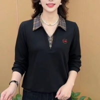 【休閒格紋寛鬆長袖】2025新款翻領假兩件寛鬆長袖 氣質減齡顯瘦 媽媽裝T恤休閒上衣 面料柔軟舒適 百搭顯氣質