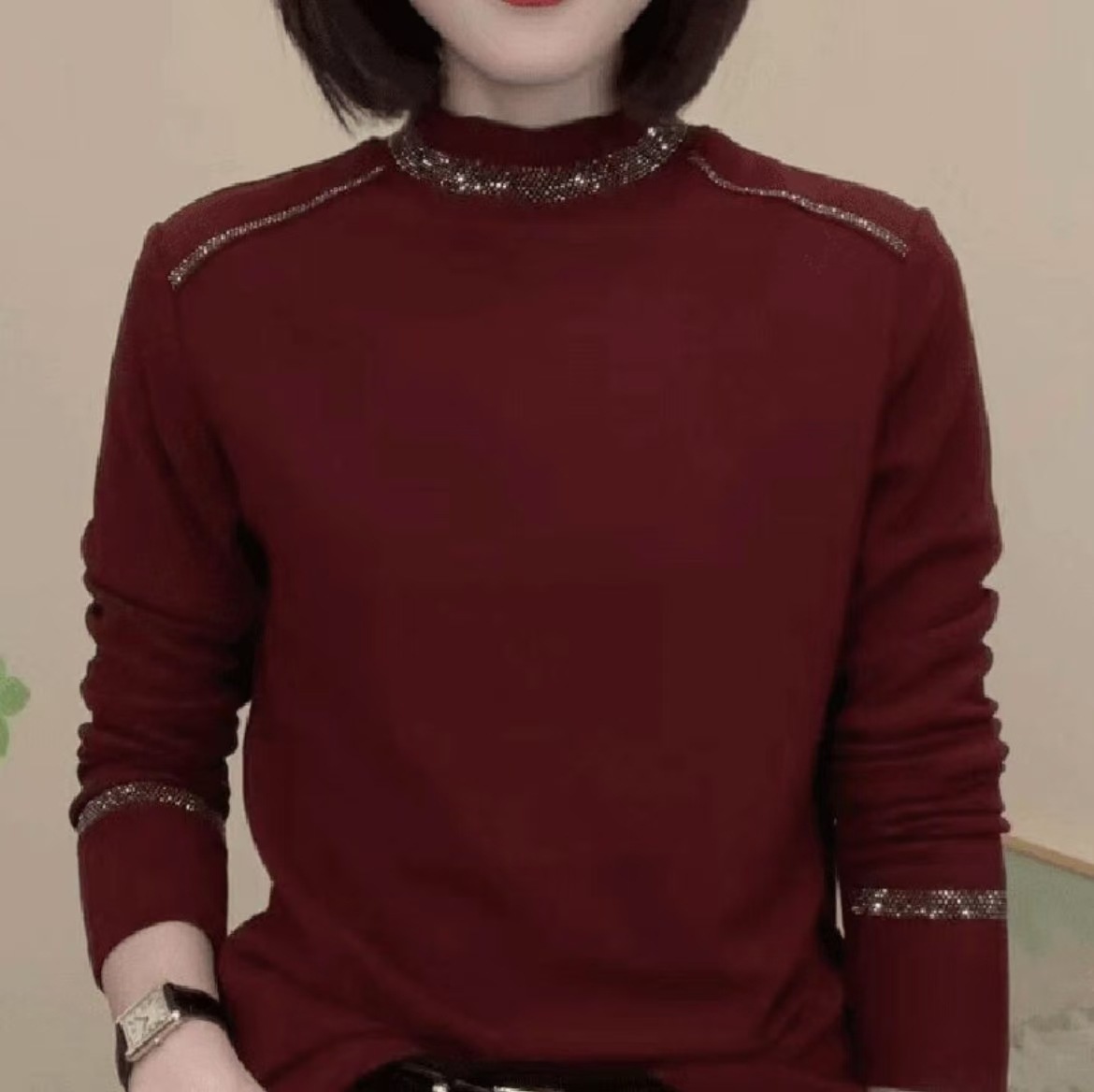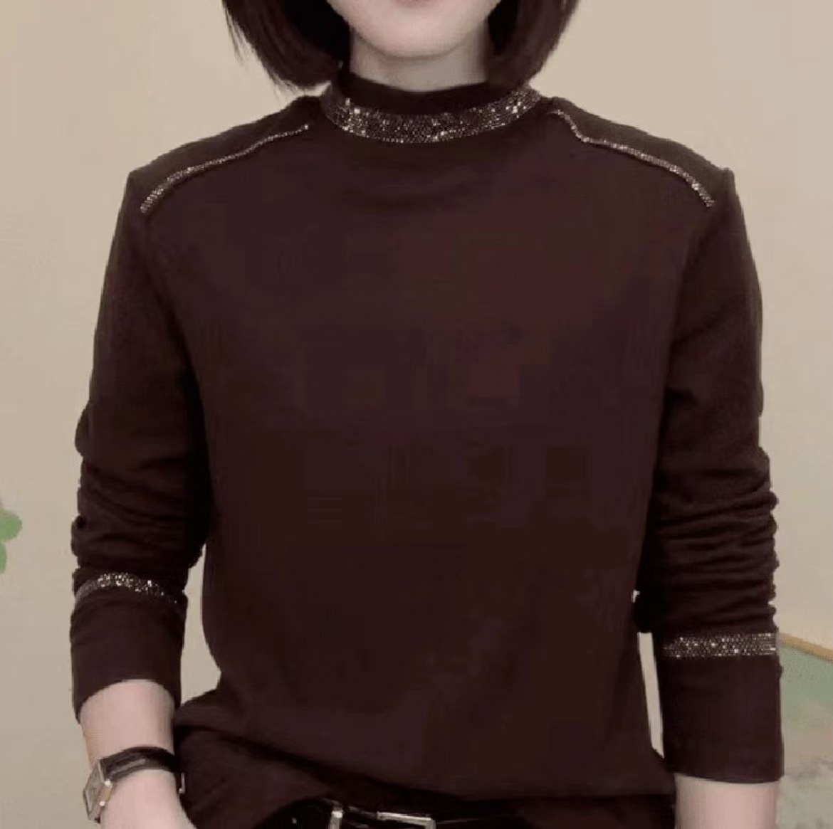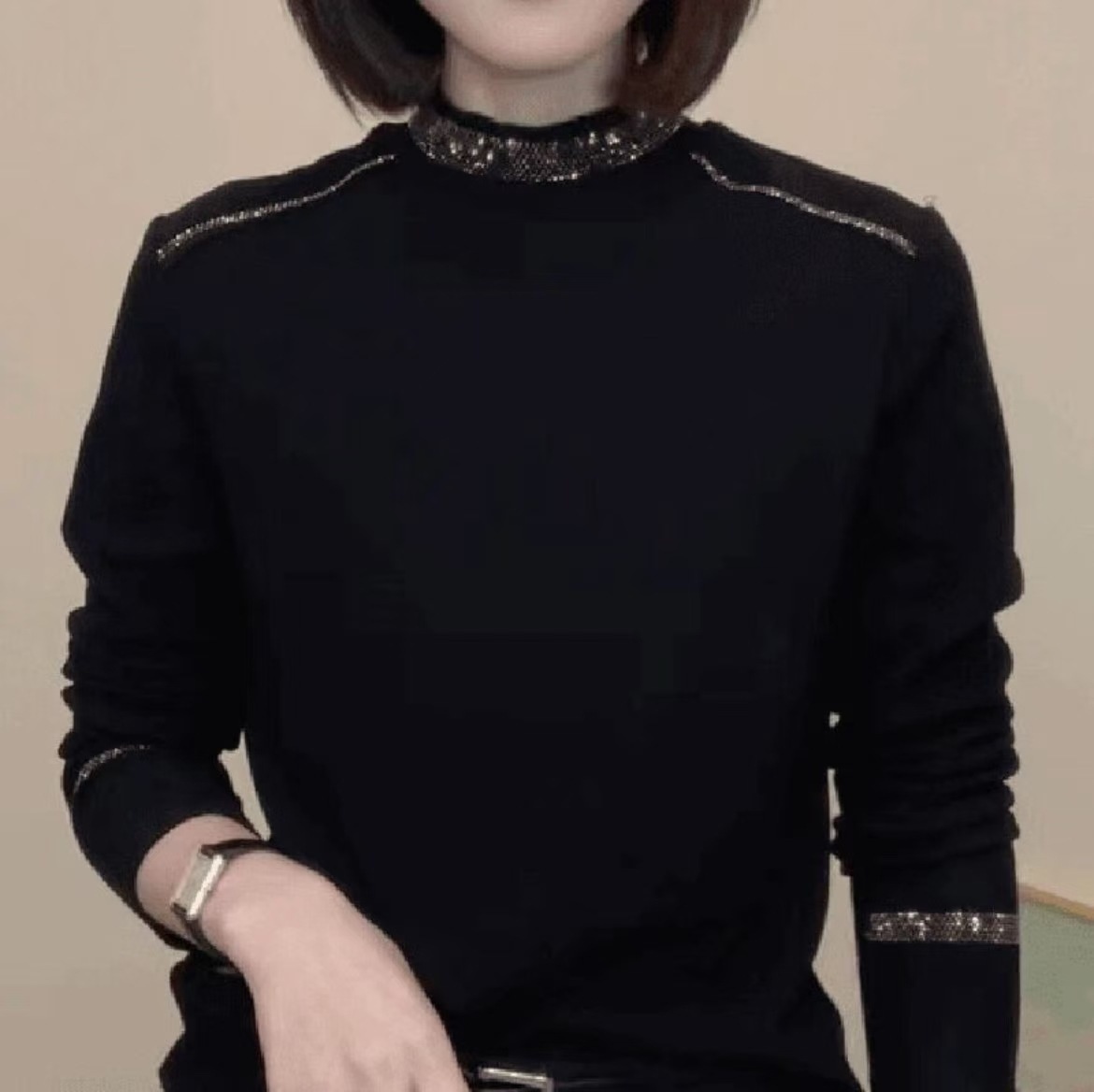 【閃鑽中領洋氣上衣】立體燙鑽點亮鎖骨線條,高彈力面料修身顯瘦,單穿內搭都充滿高級感!